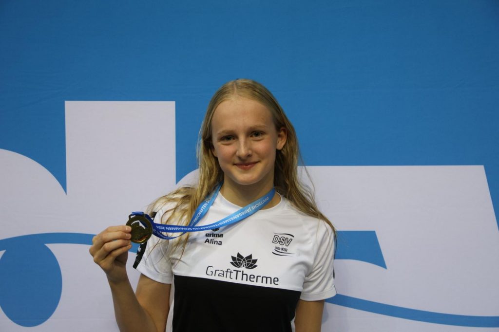 Die erste Medaille an diesem Nachmittag sicherte sich Alina Meyer (2010) vom Delmenhorster SV. Sie hatte sich als einziges der 11 niedersächsischen Mädels für das Finalrennen am Nachmittag qualifizieren können. Als Viertschnellste aus dem Vorlauf mit einer Zeit von 2:27,50 ging sie hier an den Start. Die 50 m Schmetterling beendete die Silbermedaillengewinnern vom Donnerstag auf dieser Strecke als Schnellste in ihrem Lauf in 0:29,14. Nach dem Rückenschwimmen wendeten die spätere Zweite und Alina exakt zeitgleich bei 1:07,18. Es blieb megaspannend, denn die Brustschwimmerin aus Hamburg schob sich auf dieser Teilstrecke leicht nach vorne und schlug etwas eher zur Wende an. Dann kamen die letzten 50 m und Alina Meyer ließ sich den Sieg auf der Freistilstrecke nicht mehr wegnehmen und schlug mit einer phantastischen neuen Bestzeit von 2:21,84 genau 9 Hunderstel vor Ihrer Verfolgerin aus Hamburg an. Damit sicherte sich Alina bereits ihre dritte Medaille bei dieser Deutschen Jahrgangsmeisterschaft.