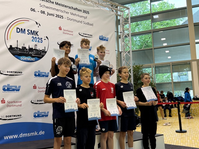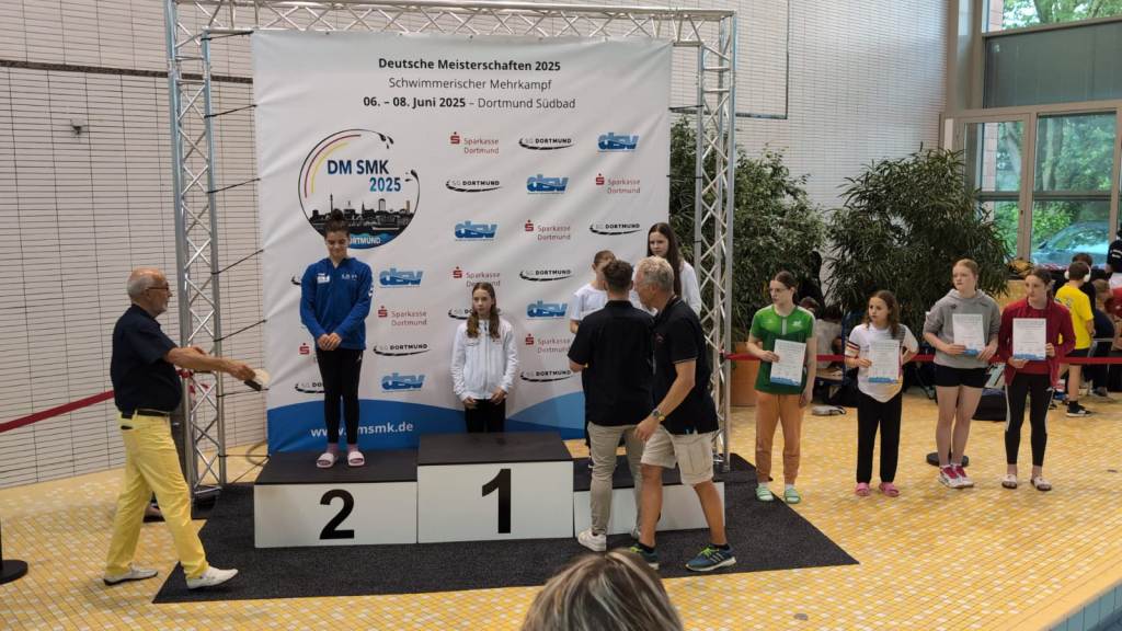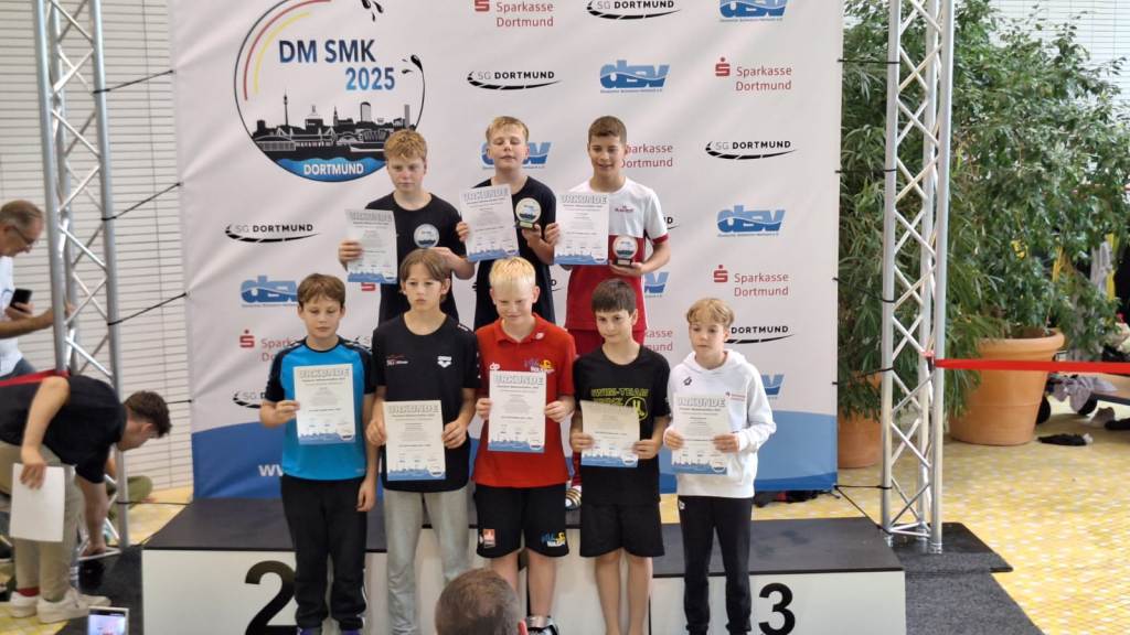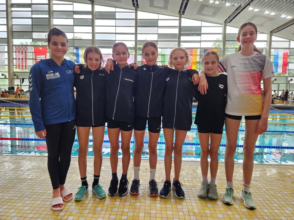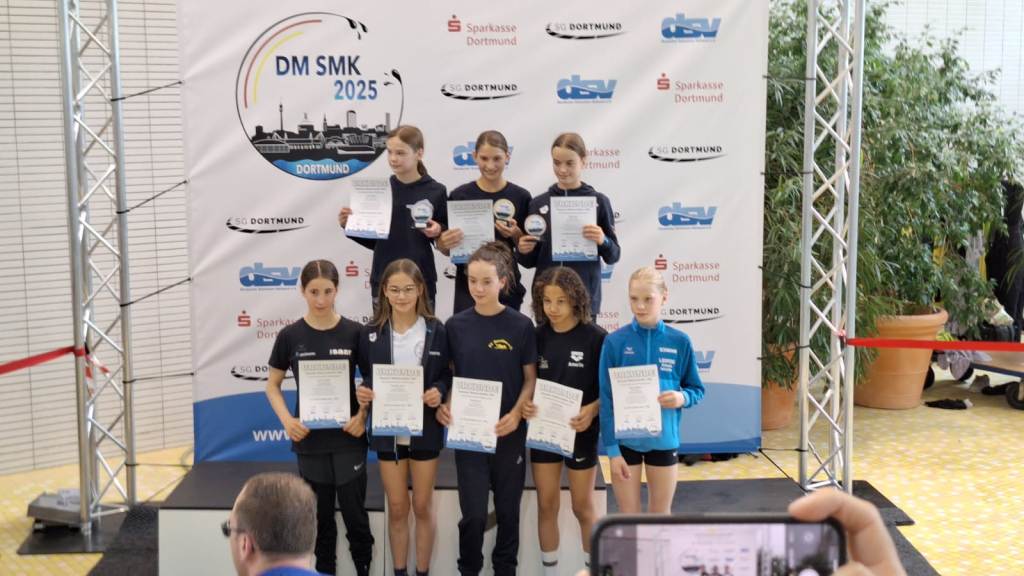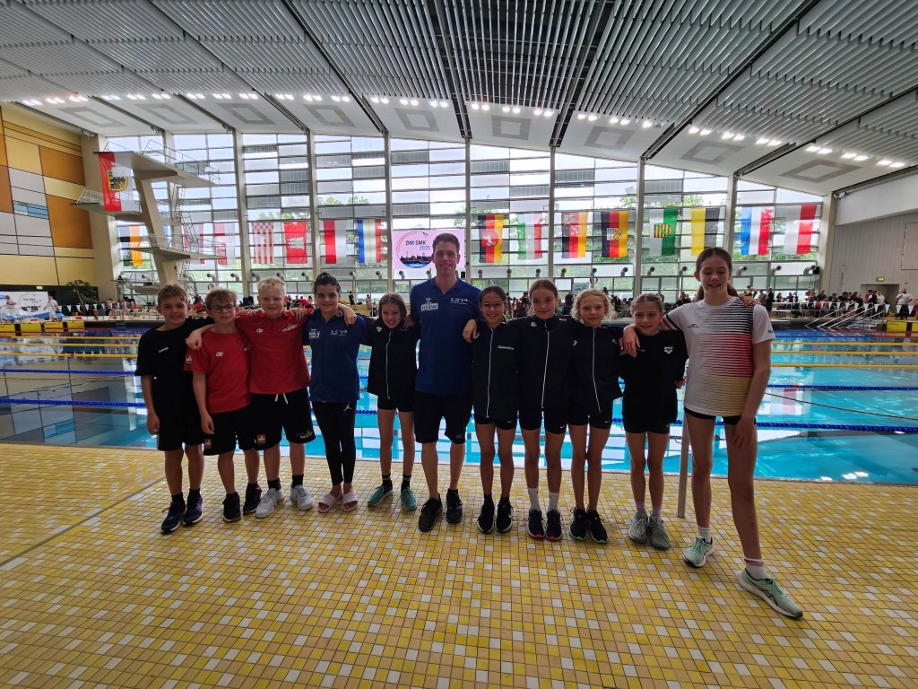 Vielseitigkeit ist das Zauberwort bei einer Veranstaltung des Schwimmerischen Mehrkampfes und genau diese bewiesen die 17 niedersächsischen Sportler am Pfingstwochenende in Dortmund. Gleich am Freitag ging es mit der längsten Strecke, den 400 m Freistil bei den Deutschen Meisterschaften des Schwimmerischen Mehrkampfes los. Sophie Schmidt (2014 / TSV Neustadt) konnte sich hier gleich um satte 5 Sekunden auf 5:00,87 verbessern und schwamm auf Platz 3 ihres Jahrganges. Jannies Müller (2014 / W98 Hannover) verbesserte sein 400 m Zeit auf 5:00,55 und schwamm auf Platz 2. Im Jahrgang 2013 der jungen Herren holte sich Olivier Awrycewicz von der SGS Hannover mit einem weiteren 3. Platz und neuer Bestzeit von 4:43,31 ebenfalls wertvolle Punkte für die Gesamtwertung. Die 50 m Beine-Strecke in der jeweiligen Disziplin, die sich die Aktiven für ihr Hauptprogramm ausgesucht hatten, stand dann für den restlichen Freitag noch auf dem Programm. Der Samstagmorgen begann mit den 25 m Delphinkicks in Bauch- und anschließend in Rückenlage. Sehr erfreulich aus Sicht der Trainer war, dass alle 17 Athleten diesen Teil ohne Disqualifikation bewältigen konnten. Die 100 und 200 m Strecken in der gewählten Schwimmart folgten nach den Delphinkicks. Bei den 100 m Schmetterling konnte Mara Kessel (2013 / WSG Wunstorf) mit neuer Bestzeit von 1:09,39 gleich ordentliche 502 Punkte für ihr Gesamtergebnis sammeln und schwamm die schnellste Zeit ihres Jahrganges über diese Strecke. Mit neuer Bestzeit von 1:13,73 über 100 m Rücken und 465 Punkten schwamm Sophie Schmidt (2014 / TSV Neustadt) die drittschnellste Zeit auf dieser Strecke. Über eine Sekunde konnte sich auch Jonas Janta (2014) von der SGS Barsinghausen auf dieser Strecke verbessern. Seine Endzeit von 1:14,13 war die Zweitschnellste seines Jahrganges. Nach dem Rückenschwimmen stand die Bruststrecke im Wettkampfplan und hier war Paul-Anton Siegfried (2013) von der SGS Braunschweig mit neuer Bestzeit von 1:20,68 der Zweitschnellste. Die drittschnellste Zeit im Jahrgang 2013 über 100 m Freistil brachte Nina Maria Reusch (SGS Hannover) mit ihrer neuen Bestzeit von 1:03,02 ins Wasser. Bei den 200 m Distanzen ihrer Lieblingsdisziplinen waren erneut einige niedersächsische Schwimmer unter den schnellsten Drei. Clementine Putzer (2013 / SGS Hannover) kam auf Platz 3 über 200 m Schmetterling mit ihrer Zeit von 2:42,92. Einen Platz besser, als vorher bei der 100 m Strecke konnte Sophie Schmidt mit ihrer neuen Bestzeit über 200 m Rücken in 2:39,12 als Zweite glänzen. Paul-Anton Siegfried war über 200 m Brust als Dritter in 2:56,10 wieder vorne mit dabei. Um fast zwei Sekunden konnte sich Nina Maria Reusch über 200 m Freistil steigern. In 2:18,12 schwamm sie hier auf Platz 2 und sicherte sich gleich 536 Punkte für die sehr gute neue Bestzeit. Die 200 m Lagen, als vielseitigste Strecke beendete den Wettkampf dann am Sonntag. Hier konnten sich nur Jannis Müller (2014) mit um drei Sekunden verbesserter Zeit von 2:44,67 und Sophie Schmidt (2014) mit ebenfalls Bestzeit von 2:43,67 jeweils auf Platz 2 präsentieren.