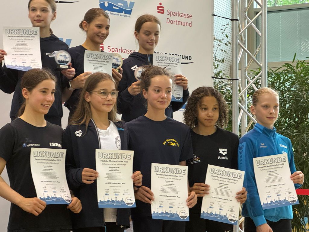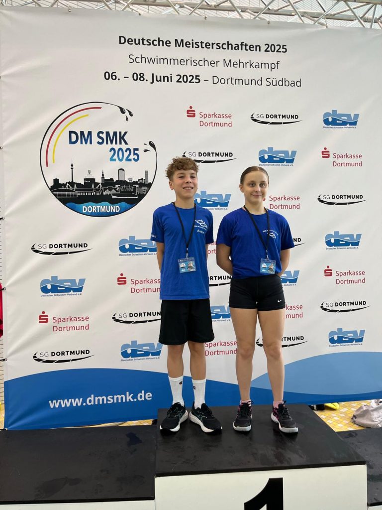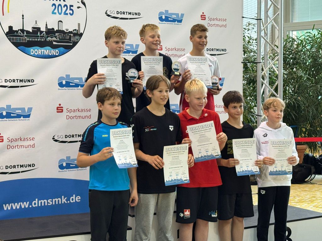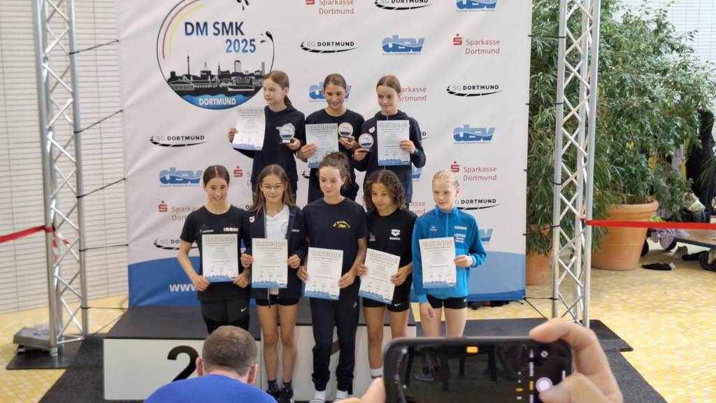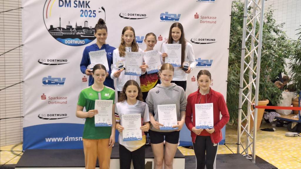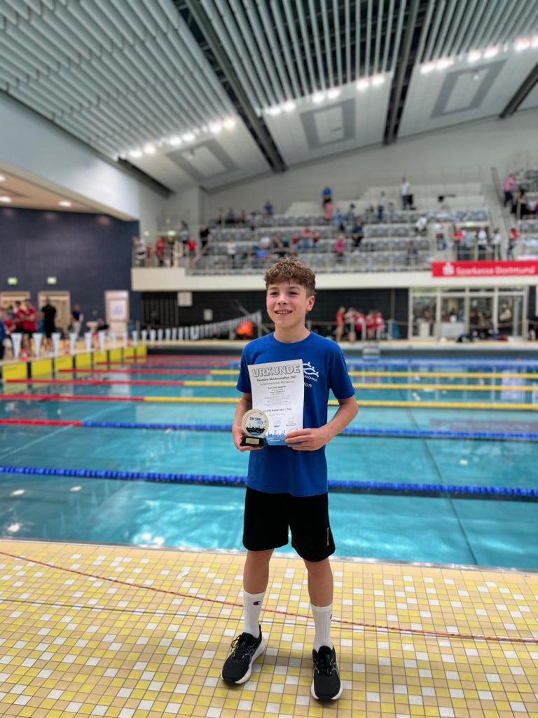Vielseitigkeit ist das Zauberwort bei einer Veranstaltung des Schwimmerischen Mehrkampfes und genau diese bewiesen die 17 niedersächsischen Sportler am Pfingstwochenende in Dortmund. Gleich am Freitag ging es mit der längsten Strecke, den 400 m Freistil bei den Deutschen Meisterschaften des Schwimmerischen Mehrkampfes los. Sophie Schmidt (2014 / TSV Neustadt) konnte sich hier gleich um satte 5 Sekunden auf 5:00,87 verbessern und schwamm auf Platz 3 ihres Jahrganges. Jannies Müller (2014 / W98 Hannover) verbesserte sein 400 m Zeit auf 5:00,55 und schwamm auf Platz 2. Im Jahrgang 2013 der jungen Herren holte sich Olivier Awrycewicz von der SGS Hannover mit einem weiteren 3. Platz und neuer Bestzeit von 4:43,31 ebenfalls wertvolle Punkte für die Gesamtwertung. Die 50 m Beine-Strecke in der jeweiligen Disziplin, die sich die Aktiven für ihr Hauptprogramm ausgesucht hatten, stand dann für den restlichen Freitag noch auf dem Programm. Der Samstagmorgen begann mit den 25 m Delphinkicks in Bauch- und anschließend in Rückenlage. Sehr erfreulich aus Sicht der Trainer war, dass alle 17 Athleten diesen Teil ohne Disqualifikation bewältigen konnten. Die 100 und 200 m Strecken in der gewählten Schwimmart folgten nach den Delphinkicks. Bei den 100 m Schmetterling konnte Mara Kessel (2013 / WSG Wunstorf) mit neuer Bestzeit von 1:09,39 gleich ordentliche 502 Punkte für ihr Gesamtergebnis sammeln und schwamm die schnellste Zeit ihres Jahrganges über diese Strecke. Mit neuer Bestzeit von 1:13,73 über 100 m Rücken und 465 Punkten schwamm Sophie Schmidt (2014 / TSV Neustadt) die drittschnellste Zeit auf dieser Strecke. Über eine Sekunde konnte sich auch Jonas Janta (2014) von der SGS Barsinghausen auf dieser Strecke verbessern. Seine Endzeit von 1:14,13 war die Zweitschnellste seines Jahrganges. Nach dem Rückenschwimmen stand die Bruststrecke im Wettkampfplan und hier war Paul-Anton Siegfried (2013) von der SGS Braunschweig mit neuer Bestzeit von 1:20,68 der Zweitschnellste. Die drittschnellste Zeit im Jahrgang 2013 über 100 m Freistil brachte Nina Maria Reusch (SGS Hannover) mit ihrer neuen Bestzeit von 1:03,02 ins Wasser. Bei den 200 m Distanzen ihrer Lieblingsdisziplinen waren erneut einige niedersächsische Schwimmer unter den schnellsten Drei. Clementine Putzer (2013 / SGS Hannover) kam auf Platz 3 über 200 m Schmetterling mit ihrer Zeit von 2:42,92. Einen Platz besser, als vorher bei der 100 m Strecke konnte Sophie Schmidt mit ihrer neuen Bestzeit über 200 m Rücken in 2:39,12 als Zweite glänzen. Paul-Anton Siegfried war über 200 m Brust als Dritter in 2:56,10 wieder vorne mit dabei. Um fast zwei Sekunden konnte sich Nina Maria Reusch über 200 m Freistil steigern. In 2:18,12 schwamm sie hier auf Platz 2 und sicherte sich gleich 536 Punkte für die sehr gute neue Bestzeit. Die 200 m Lagen, als vielseitigste Strecke beendete den Wettkampf dann am Sonntag. Hier konnten sich nur Jannis Müller (2014) mit um drei Sekunden verbesserter Zeit von 2:44,67 und Sophie Schmidt (2014) mit ebenfalls Bestzeit von 2:43,67 jeweils auf Platz 2 präsentieren.