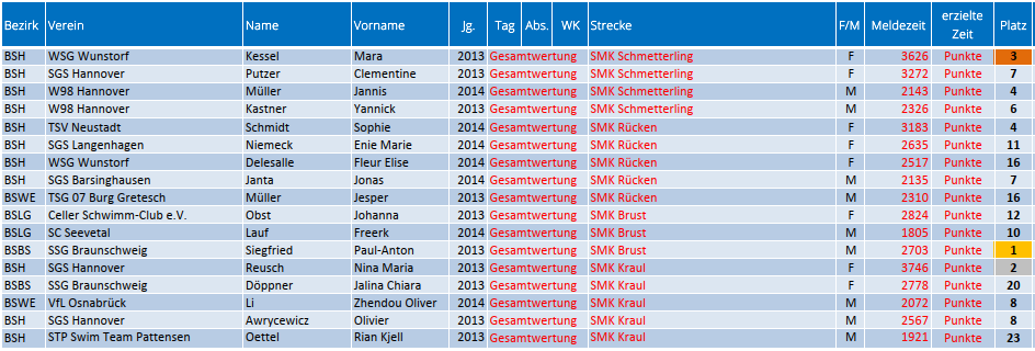 Bei der Endabrechnung konnte das Team aus Niedersachsen dann mit jeweils einer Medaille in jeder Farbe glänzen. Gold ging in der Gesamtwertung SMK Brust im Jahrgang 2013 an Paul-Anton Siegfried von der SSG Braunschweig.