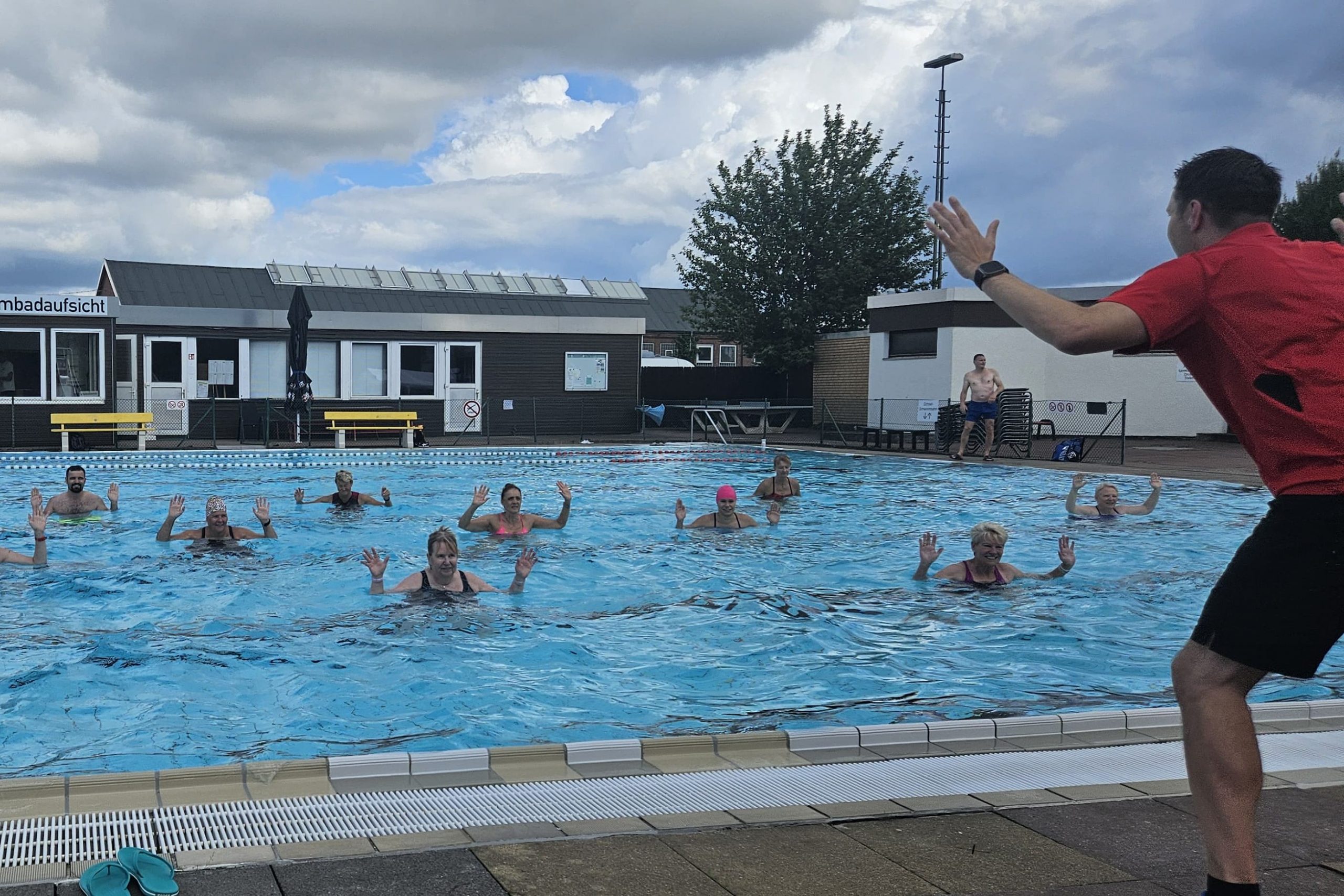 Während Maik die Teilnehmer:innen mit schnellen Koordinationsübungen ein wenig außer Atem brachte, vermittelte Derya Özsayiner den Inhalt einer ersten Kursstunde für Erwachsene Nichtschwimmer mit Erst-Schwimmart Rücken.