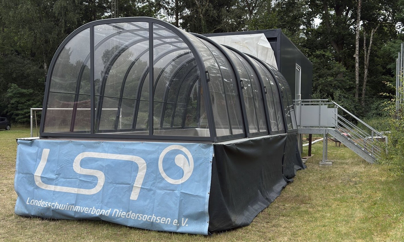 Seit Anfang August ist unser mobiler Pool in Buchholz im Einsatz – und eröffnet dort ganz neue Möglichkeiten für die Schwimmausbildung. Nachdem das örtliche Lehrschwimmbecken kurzfristig nicht mehr zur Verfügung stand, musste der Verein schnell handeln. In Zusammenarbeit mit dem LSN konnte innerhalb weniger Wochen eine Lösung gefunden werden: Der mobile Pool bietet nun eine dringend benötigte Alternative für Kinder, Anfänger:innen und weitere Interessierte.