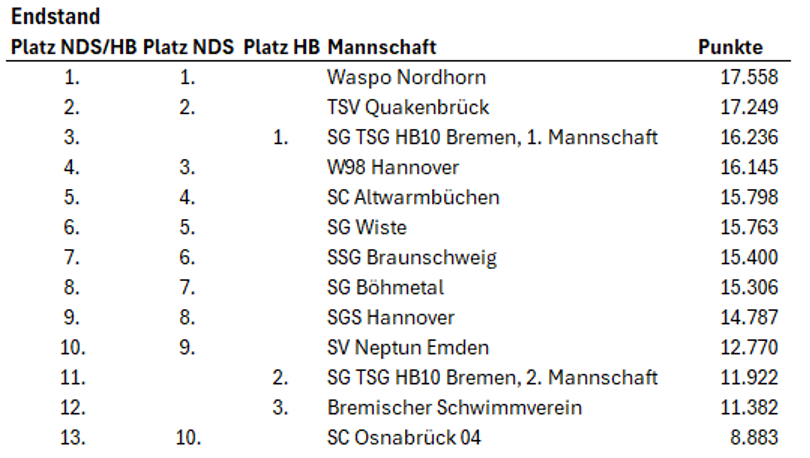 Die Bremer Wertung ging an die 1. Mannschaft der SG TSG HB10 Bremen. Mit 16.236 Punkten erzielten die Hansestädter die drittbeste Punktzahl, verzichten aber wie Altwarmbüchen auf eine Finalteilnahme. Erstmals am Start waren die Team der SG Böhmetal, der SSG Braunschweig, des SC Altwarmbüchen und nach längerer Pause auch der SV Neptun Emden.