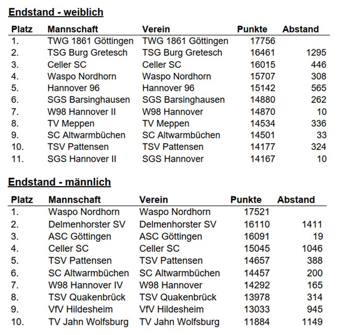 Die drei in der Mittagspause führenden Herrenmannschaften standen am Ende des Tages auch auf dem Siegerpodest. Der Landesligasieg ging an Waspo Nordhorn mit 17.687 Punkte vor dem Delmenhorster SV (16.258 Punkte) und die Winzigkeit von 2 Punkten dahinter ging Bronze an den ASC Göttingen.