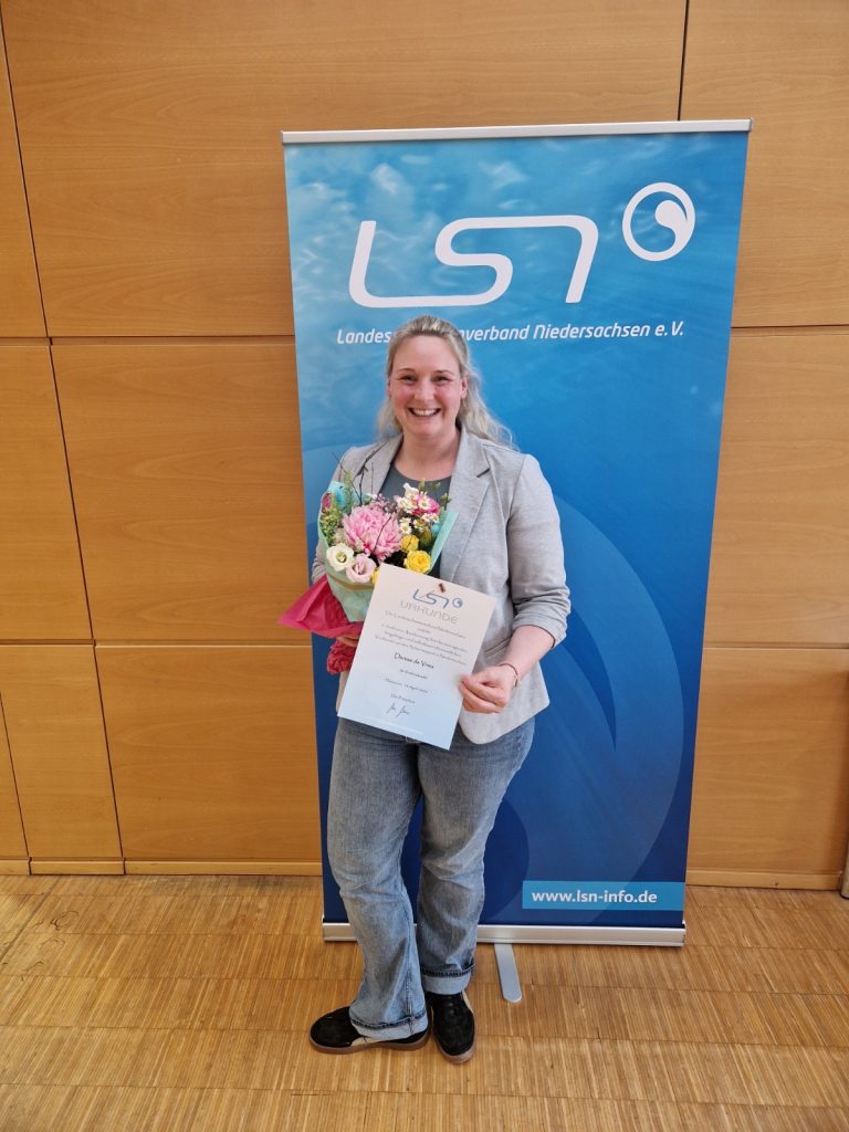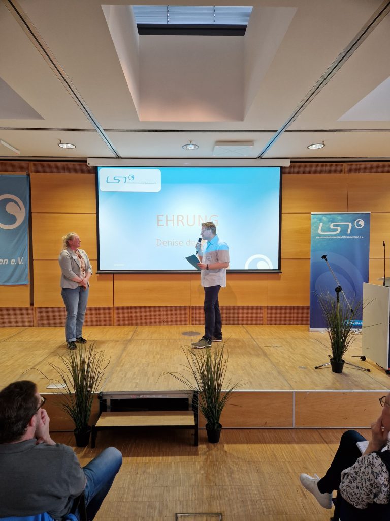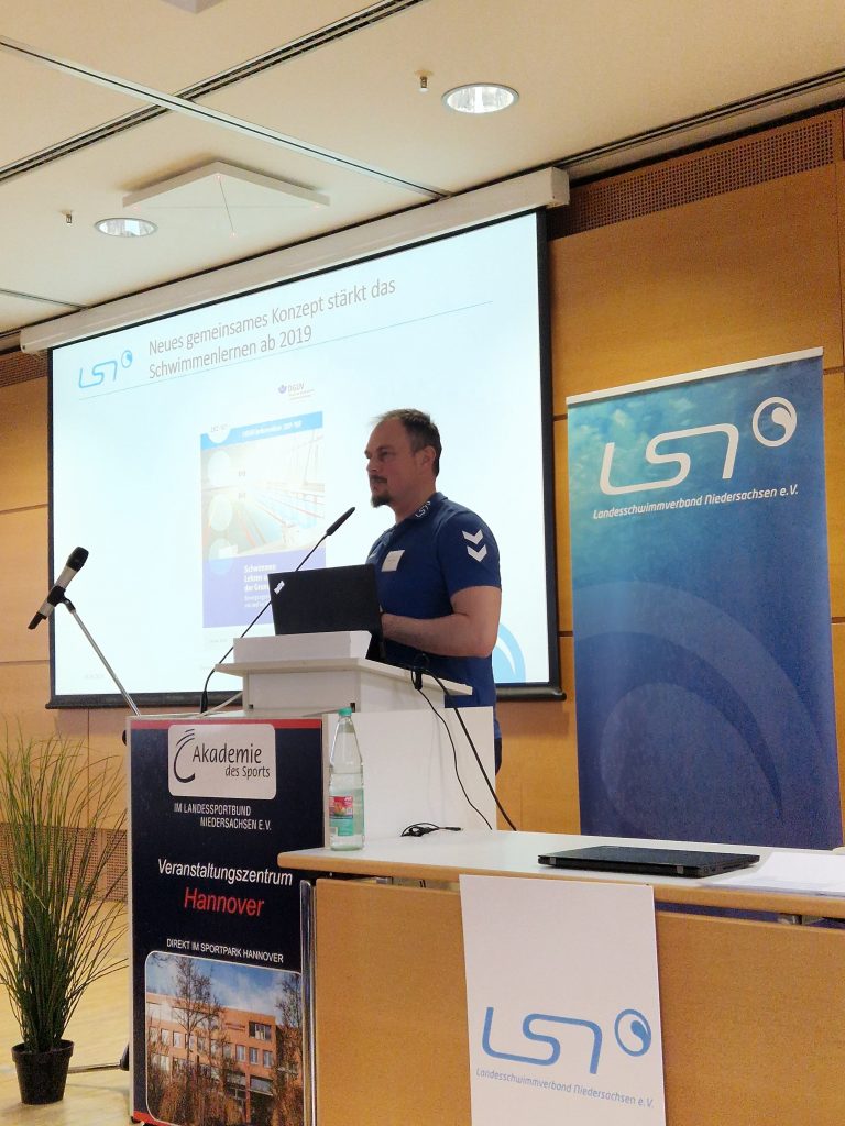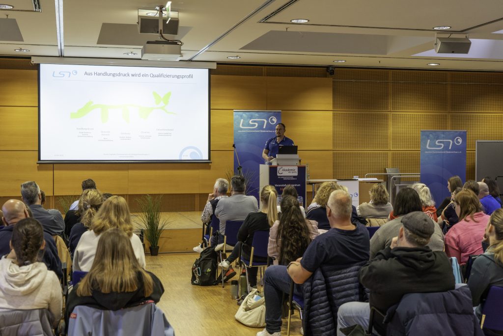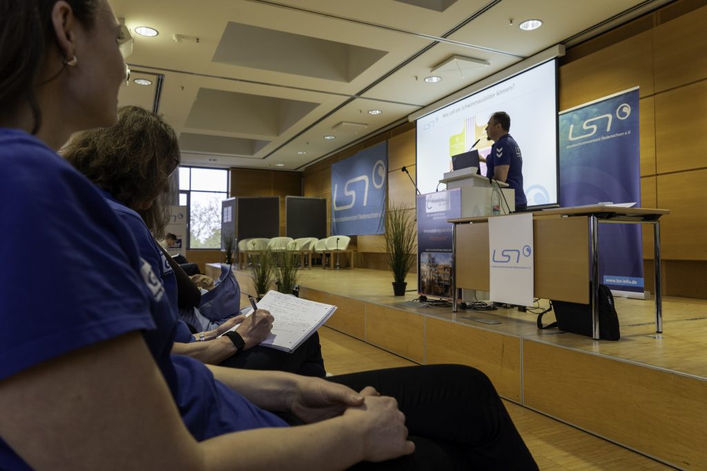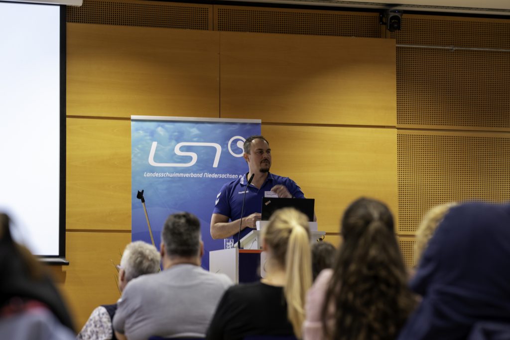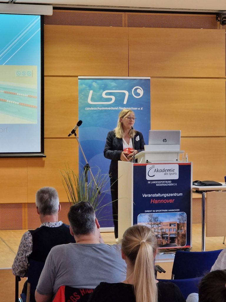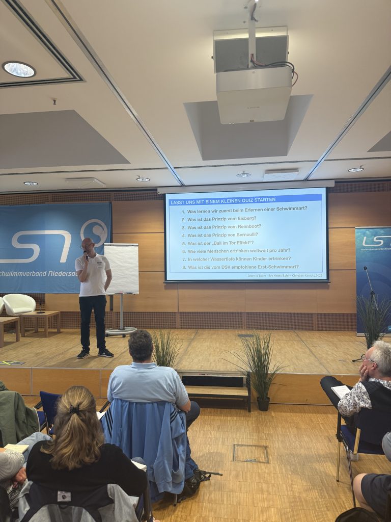 Zum Start am Samstag begrüßte LSN-Vizepräsident Breitensport Matthias Michaelsen die Teilnehmenden und gab den Auftakt für ein vielseitiges Programm. Gleich zu Beginn gab es direkt noch einen besonderen Überraschungsmoment: Denise de Vries, Teilnehmerin und LSN-Referentin, wurde mit der LSN-Verdienstnadel ausgezeichnet – die Freude war ihr (und dem Publikum) deutlich anzusehen. Herzlichen Glückwunsch, liebe Denise! Wir sind sehr dankbar für deine wichtige und engagierte Arbeit im Bereich der Anfängerschwimmausbildung!