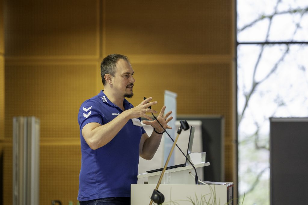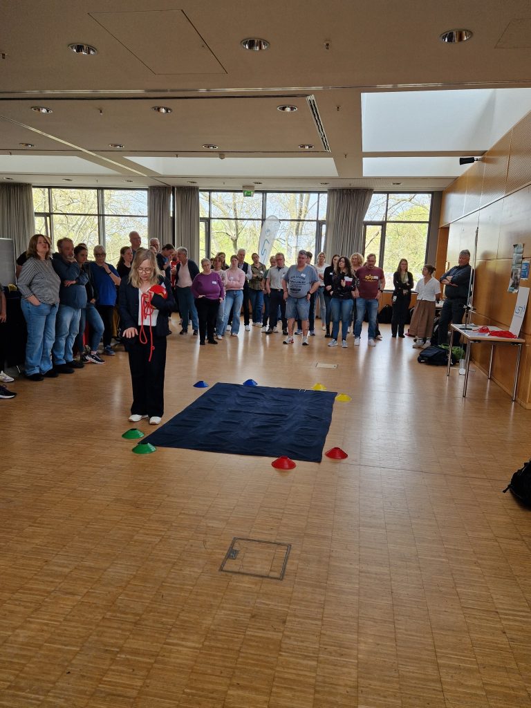 Mit dem DOSB-Projekt „Learn to Swim“ brachte Christian Karsch anschließend eine weitere wichtige Perspektive ein. In seinem interaktiven Vortrag band er die Teilnehmenden immer wieder aktiv ein, unter anderem mit einem kleinen Quiz rund um die Schwimmausbildung. Eine Frage daraus blieb definitiv hängen: Wie viele Menschen ertrinken weltweit jedes Jahr? Hättet ihr es gewusst? Die Antwort ist erschreckend: rund 120.000 Menschen. Ein eindrücklicher Moment, der noch einmal deutlich gemacht hat, wie wichtig gute Schwimmausbildung ist. Anhand von Videomaterial zeigte er, wie man mit wenigen Übungen Sicherheit im Wasser vermitteln kann…Seestern auf dem Rücken, schweben, eigener Antrieb ohne Panik. Nach der Mittagspause wurde das Thema noch praxisnäher und spielerischer vertieft. Einige Übungsideen konnten die Teilnehmenden direkt im Saal ausprobieren, zum Beispiel kleine Reaktionsspiele wie das Abtauchen unter einer über den Kopf geführten Poolnudel.
