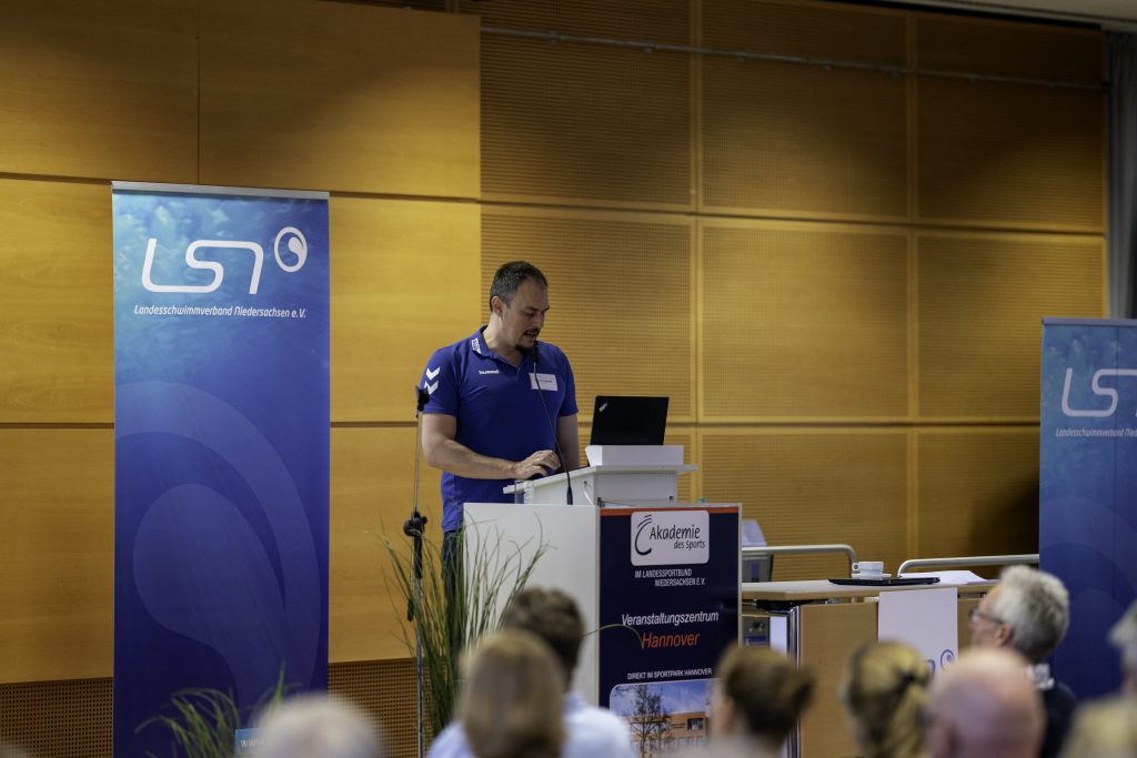 Ein Highlight zum Abschluss war die Podiumsdiskussion mit Vertreter:innen aus Praxis und Verband. Hierbei ging es um aktuelle Herausforderungen und Perspektiven im Bereich Anfängerschwimmen. Moderiert wurde die Runde von Sascha Dalig. Gemeinsam mit Dr. Janina Braun, Carolin Friedrich, Yannick Hagedorn, Christian Karsch, Denise de Vries und Dennis Yaghobi wurden zentrale Themen intensiv diskutiert – darunter der aktuelle Stand der Schwimmfähigkeit in Niedersachsen, die besonderen Herausforderungen in ländlichen Regionen sowie die Zusammenarbeit zwischen Schulen, Vereinen und weiteren Akteuren der Schwimmförderung. Zum Abschluss stellte Sascha Dalig die Frage, wie sich das Schwimmenlernen in Zukunft entwickeln sollte. Die Antworten zeigten deutlich: Es gibt großes Potenzial, aber auch jede Menge Handlungsbedarf. Genannt wurden unter anderem Schwimmen als grundlegende Kompetenz, vergleichbar mit Lesen und Schreiben, der Ausbau von Lehrschwimmbecken als Basis für eine flächendeckende Ausbildung, eine frühzeitige Förderung bereits im Kita-Alter sowie eine intensivere Zusammenarbeit aller beteiligten Akteure. Und: Ohne Breite keine Spitze!