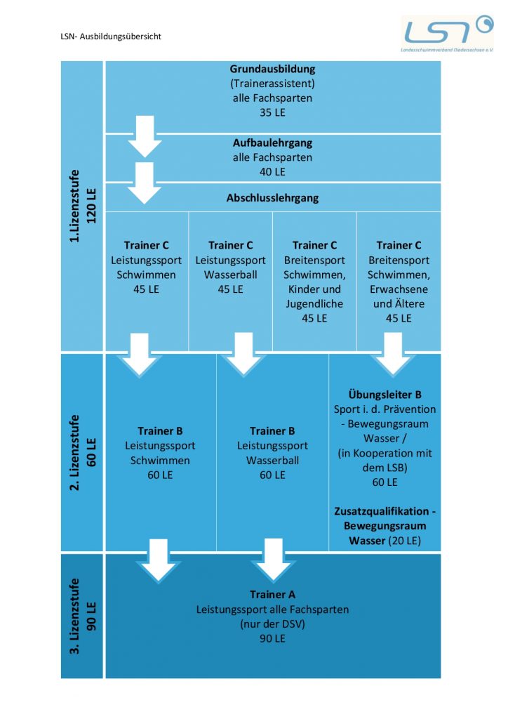 Trainer C Leistungssport: Die Ausbildung qualifiziert für die schwimmerische und fachspezifische Grundausbildung sowie für die Planung, Durchführung und Auswertung des Trainingsbetriebs mit Kindern und Jugendlichen im sportartspezifischen Leistungssport mit dem Schwerpunkt Planung, Durchführung und Auswertung des Grundlagentrainings. Verbindliche Grundlage sind die jeweils aktuellen Nachwuchskonzeptionen und Rahmentrainingspläne der Fachsparten des DSV´s. Beim LSN werden die Spezialisierungen Schwimmen und Wasserball angeboten.